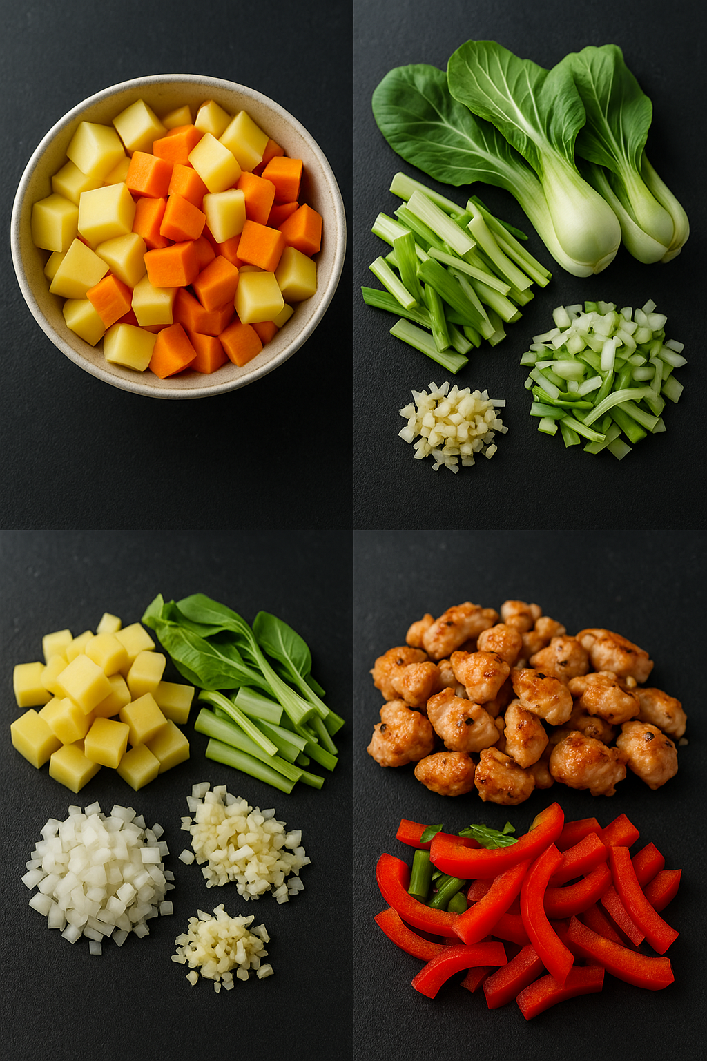 Kartoffeln, Möhren, Zwiebeln, Paprika & Pak-Choi-Streifen 3–4 Min. anschwitzen