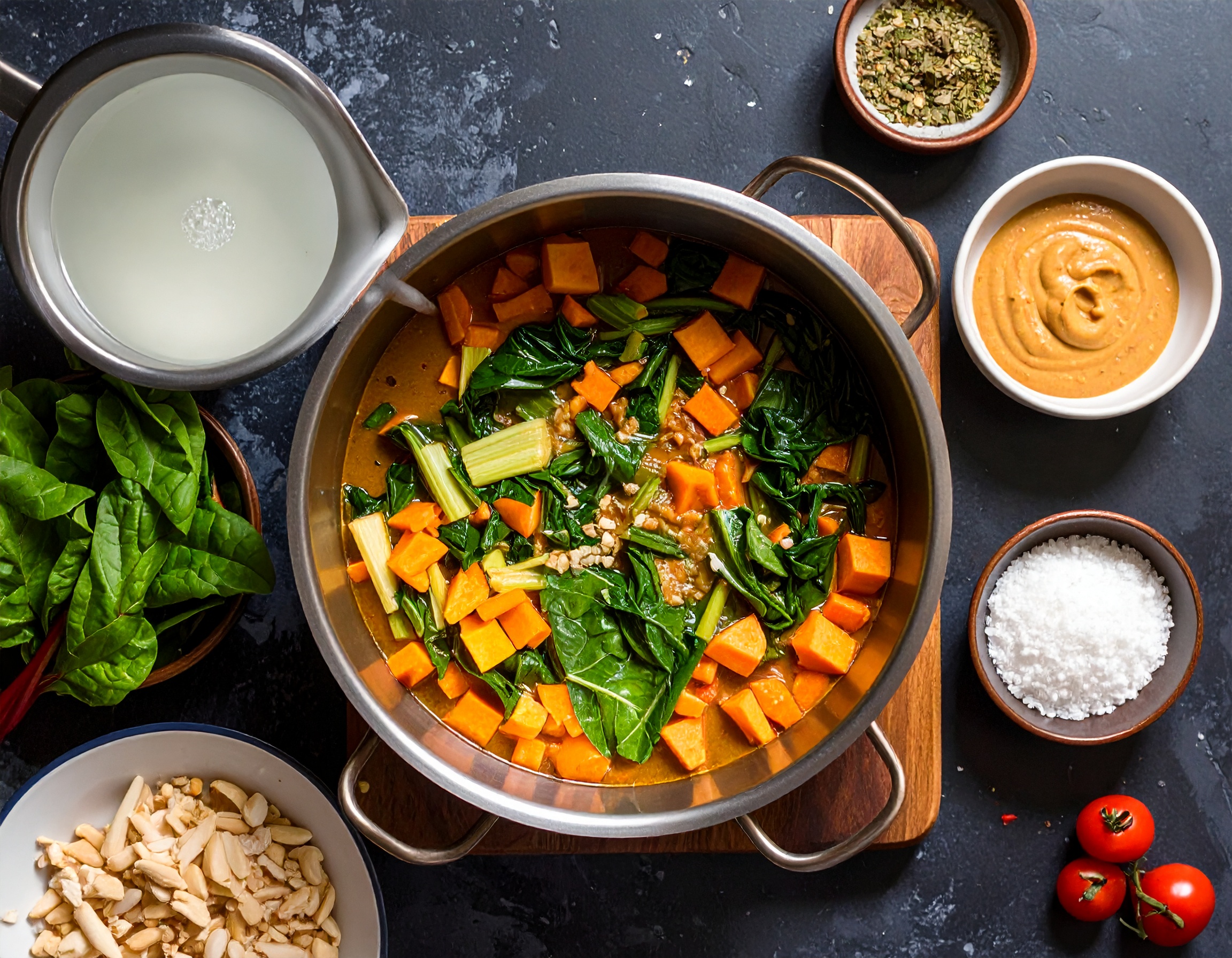 Pfanne mit 250 ml Wasser aufgießen. Süßkartoffeln würfeln und zugeben. Tom-Kha-Paste, Erdnussbutter, Palmzucker, Kokosmilchpulver und angedrücktes Zitronengras einrühren. Mangoldstiele in Scheiben schneiden, zugeben, Blätter noch zurückhalten.